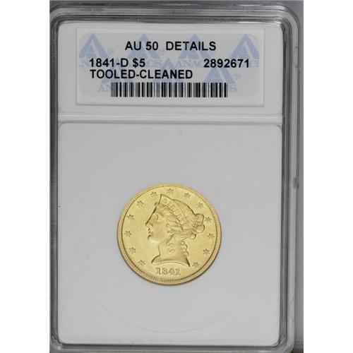 <B>1841-D $5 Tall D--Tooled, Cleaned--ANACS. AU50 Details.</B></I> Variety 5-B. The left obverse field and the areas around the eagle show signs of manipulation, and the yellow-orange surfaces display unnatural luster. Well struck with scattered handling marks.<BR><BR><b>Shipping:</b> Coin/Currency (<a target="_blank" href="http://www.heritageauctions.com/common/shipping.php">view shipping information</a>)