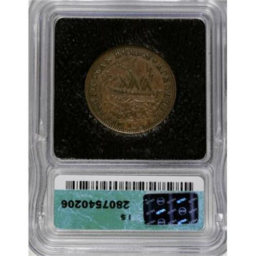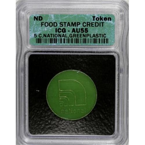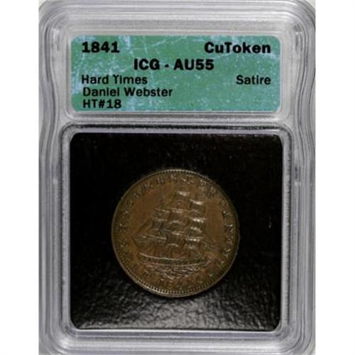 <B>1841 Daniel Webster AU55 ICG.</B></I> Low-60, HT-18,<B> </B></I>DeWitt-CE-1838-10, R.1, Copper, medium brown with a faded mark on the upper reverse field; and an <B>Undated National Stores 5C Food Stamp Credit AU55 ICG, </B></I>struck in green plastic.<BR><BR><b>Shipping:</b> Coins & Currency (<a target="_blank" href="http://www.heritageauctions.com/common/shipping.php">view shipping information</a>)