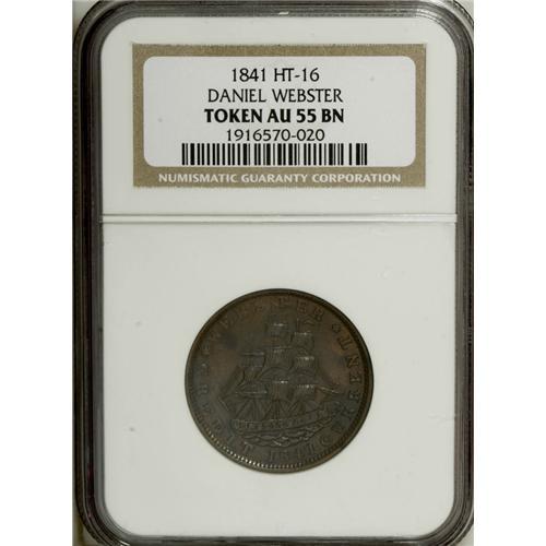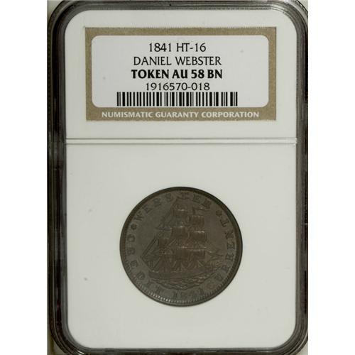 <B>1841 Daniel Webster Group Lot.</B></I> HT-16, R.1. Two pieces of the popular Daniel Webster token paired with the NOT ONE CENT FOR CREDIT reverse, <B>one AU58, one AU55,</B></I> both smooth, lustrous, and attractive. Market value is about $150-$200.<BR><BR><b>Shipping:</b> Coins & Currency (<a target="_blank" href="http://www.heritageauctions.com/common/shipping.php">view shipping information</a>)