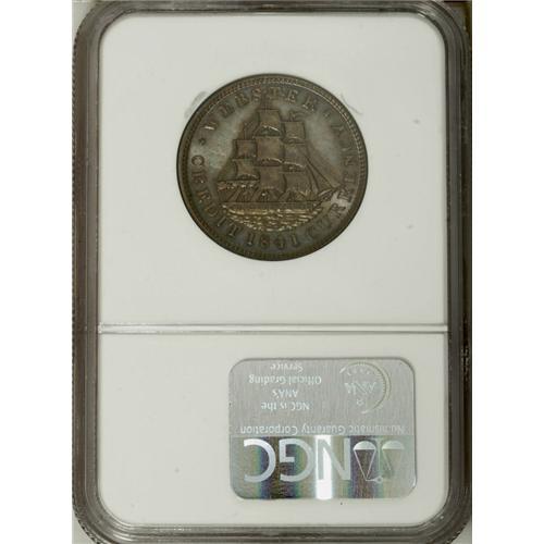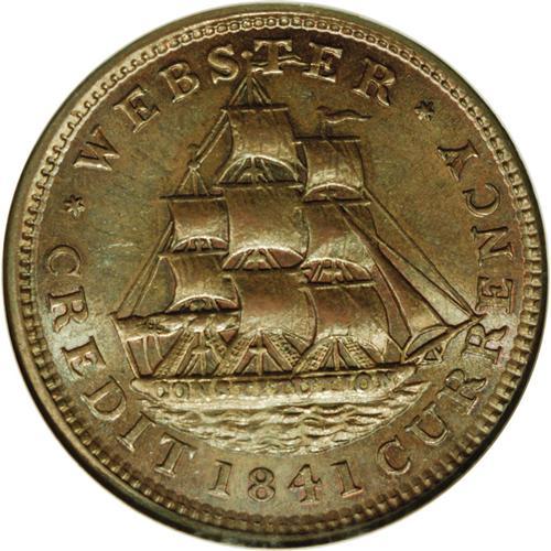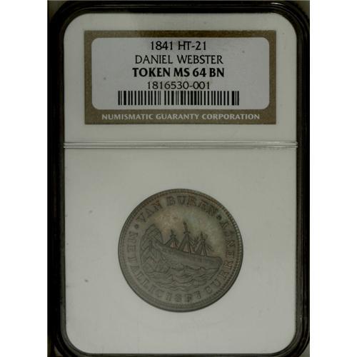 <B>1841 Daniel Webster MS64 Brown NGC.</B></I> HT-21, R.2. Copper. A lustrous example with green and blue toning and a hint of original red mint luster surrounding the lettering and the ships. The Rulau catalog value is $250 in MS60.<BR><BR><b>Shipping:</b> Coin/Currency (<a target="_blank" href="http://www.heritageauctions.com/common/shipping.php">view shipping information</a>)