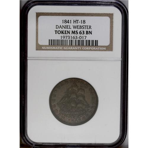 <B>1841 Daniel Webster, Low-60, Rulau-HT-18, DeWitt-CE-1838-10, R.1, MS63 Brown NGC.</B></I> Copper. Somewhat softly struck on most of the devices, but well preserved and free of surface distractions. Deep greenish-brown toning over each side yields to rose iridescence near the peripheries. A pleasingly smooth and lustrous Mint State specimen.<BR><I>From The Troy Wiseman Collection.</B></I>