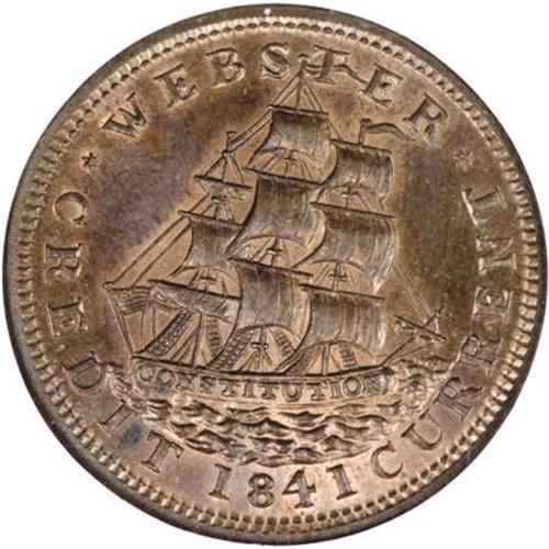 <B>1841 Daniel Webster, HT-20, MS64 Brown NGC.</B></I> Low-62, DeWitt-CE-1838-12, R.1. Copper. Another sublime example with glossy reflective surfaces and a rich chocolate appearance. This pleasing example would enhance any Hard Times collection. <BR><I>From The Madison Collection.</B></I><BR><BR><b>Shipping:</b> Coins & Currency (<a target="_blank" href="http://www.heritageauctions.com/common/shipping.php">view shipping information</a>)