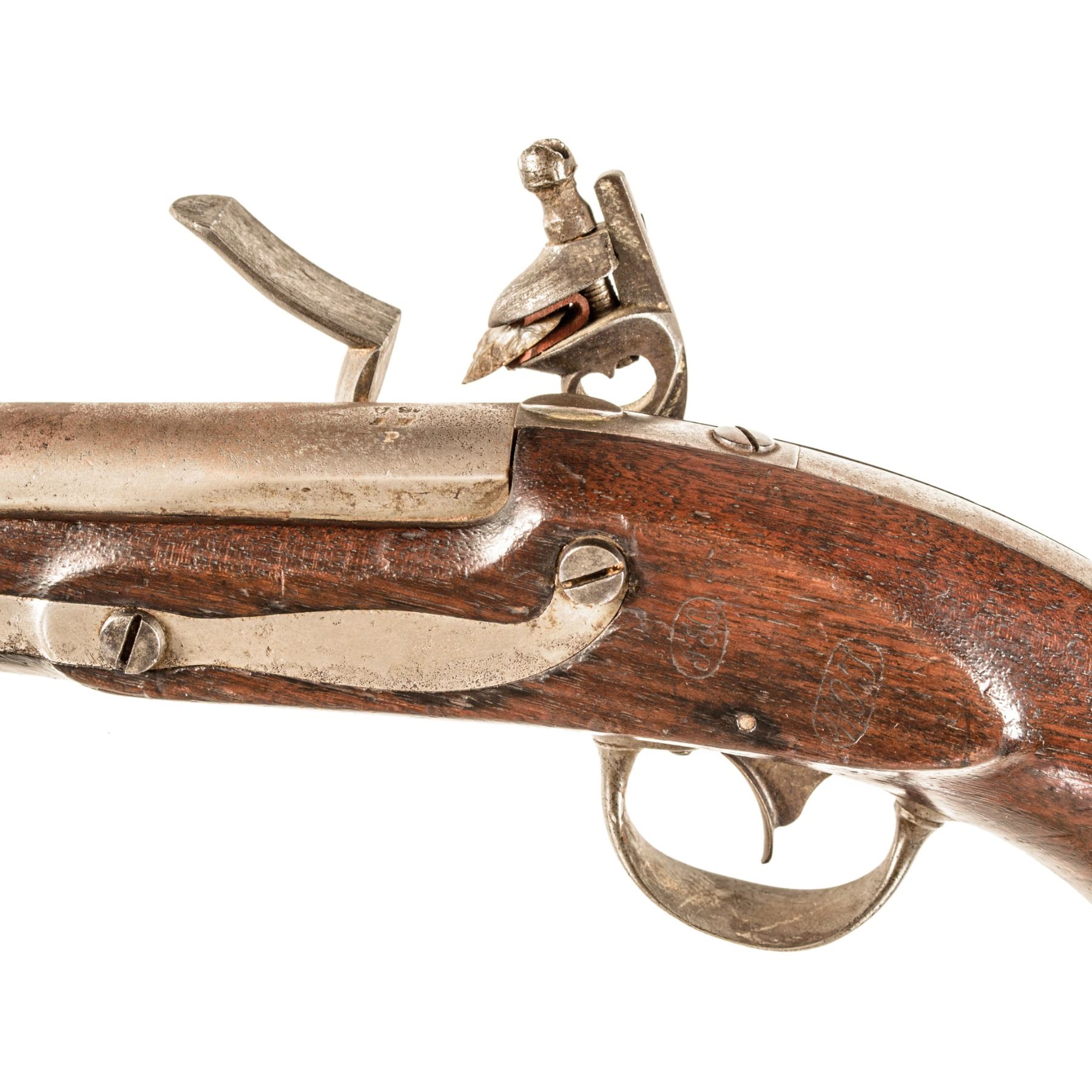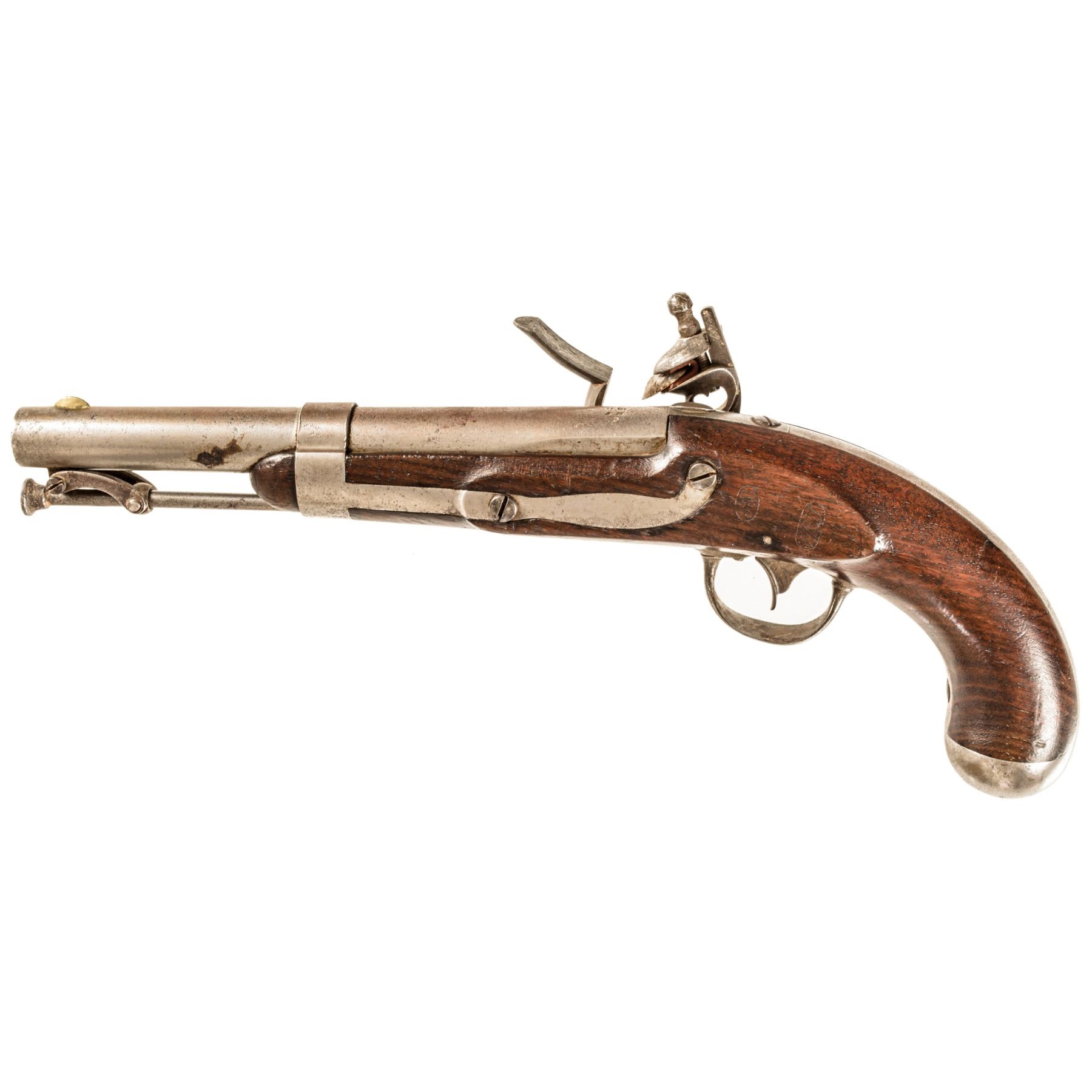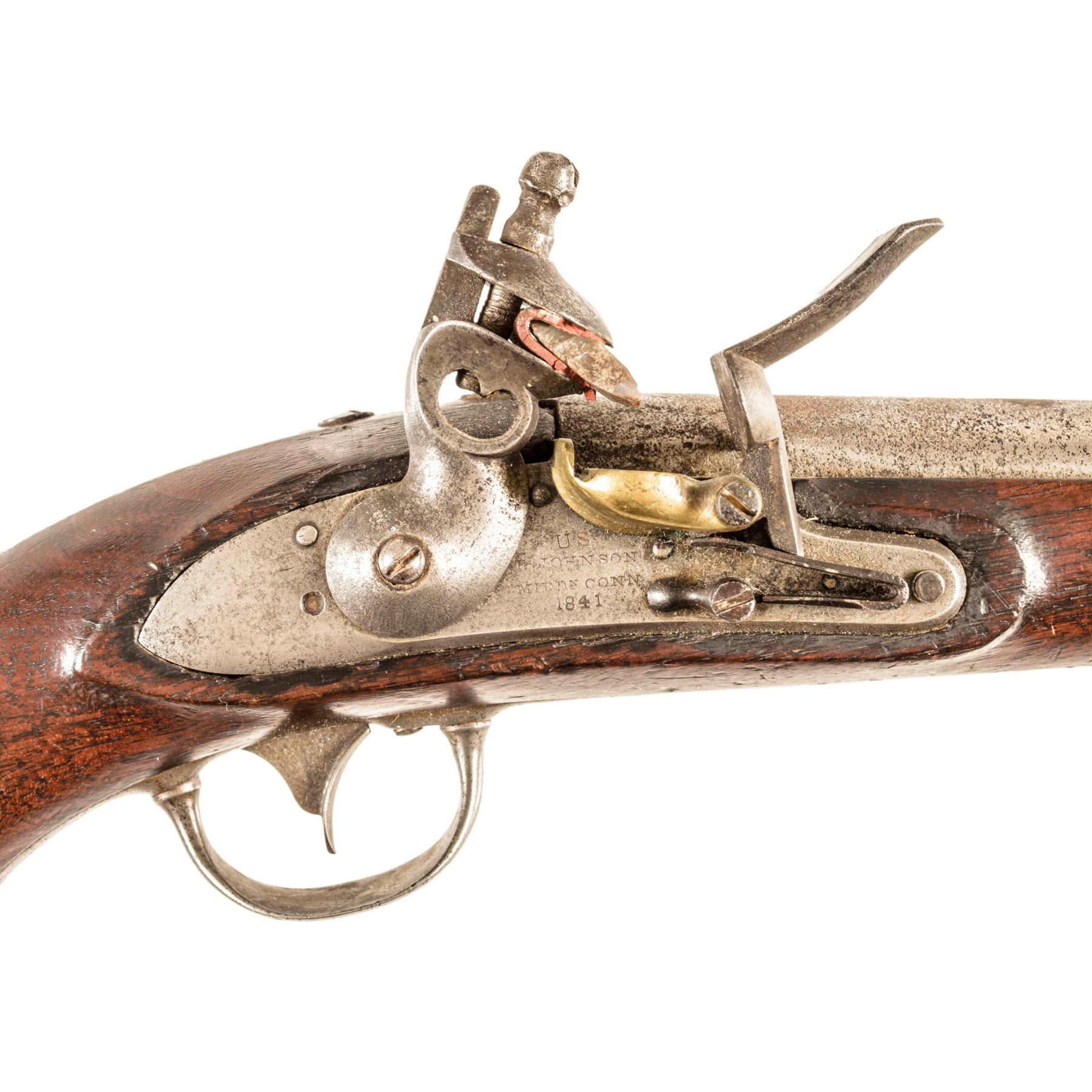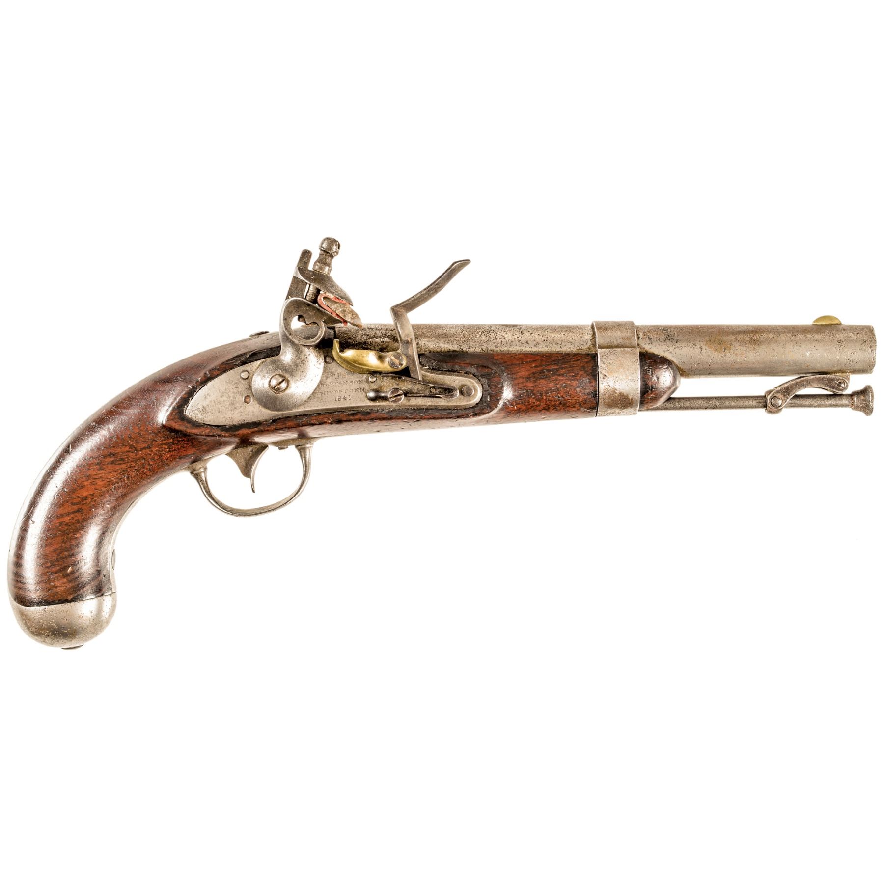 A nice natural appearing Model 1836 Flintlock Service Pistol in good working order and nice in eye appeal for display. U.S. Military Model 1836 Flintlock Service Pistol, marked “R. JOHNSON, MIDDN. CONN. 1841”. The Lock is stamped with Maker's Mark below “U S” Inspector's mark. It has a. 8.5" .54 caliber round Iron barrel, Stamped at breech with Inspector's marks; “J H” and has a Brass blade front sight, measuring 14" in overall length. It is in its original Flintlock configuration with Captive ramrod. The Stock has two very clear Inspector's Cartouche Stamps on the left side at the rear of the side plate. Overall, very solid with light expected scratches and dings from years of actual use in service.