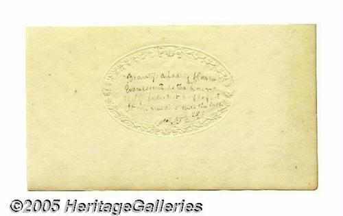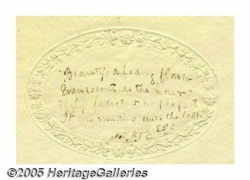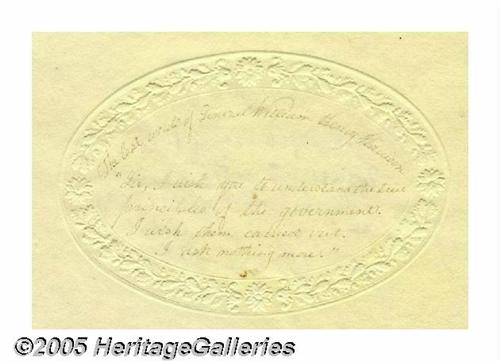 <B>1841 Death Relic - Last Words of William Henry Harrison</B></I> "<I>Sir, I wish you to understand the true principles of the government. I wish them carried out. I ask nothing more."</B></I> Stated are <I>"The last words of General William Henry Harrison"</B></I> as carefully written inside an embossed flower border on this card of 7" x 4". Coming from a famous collection of death relics of famous people, this is believed to have been written by someone actually present at the death bed of this famous military hero and U.S. President. On the verso is an unidentified verse that starts <I>"Beauty's a fading flower..."</B></I> Very fine condition. Lot:256