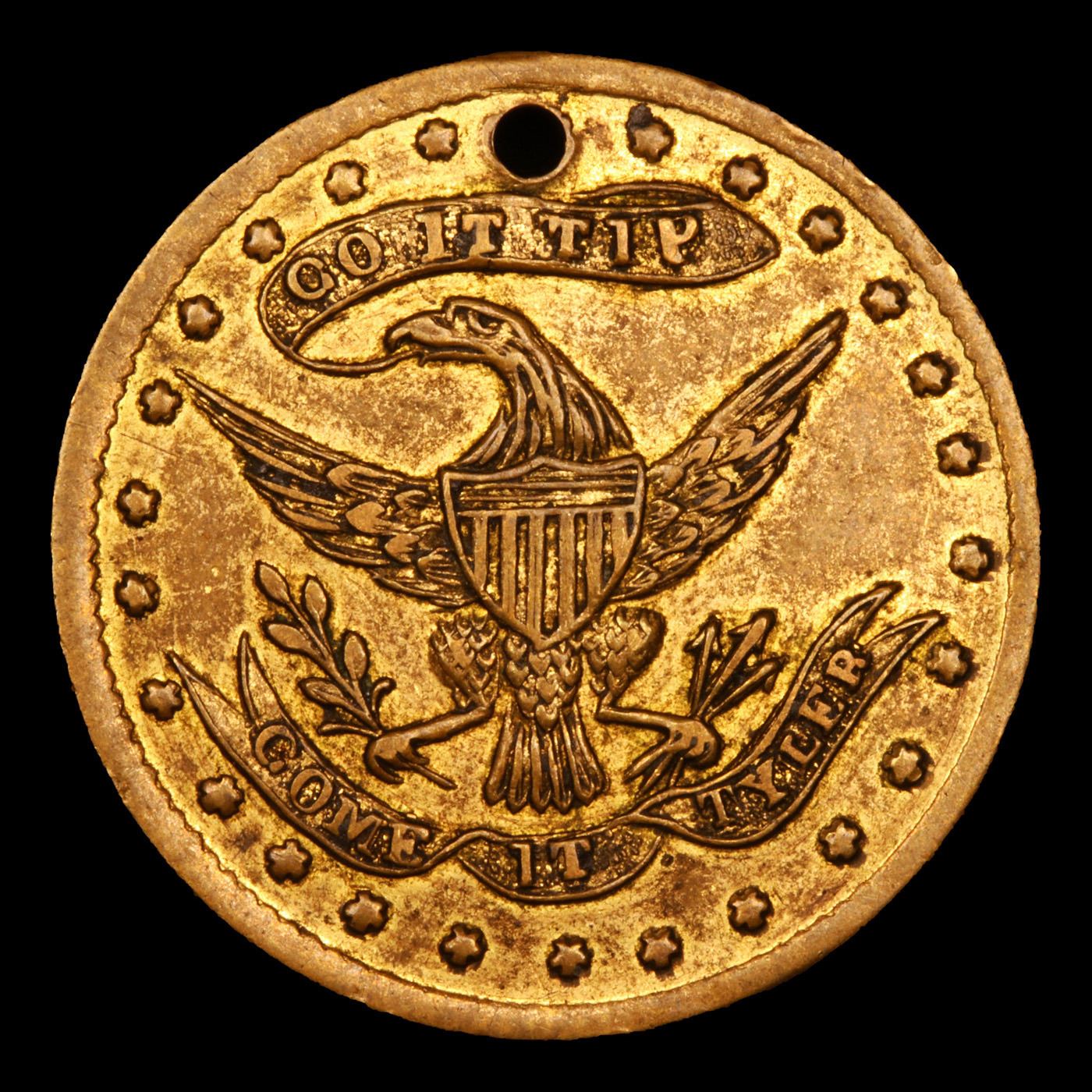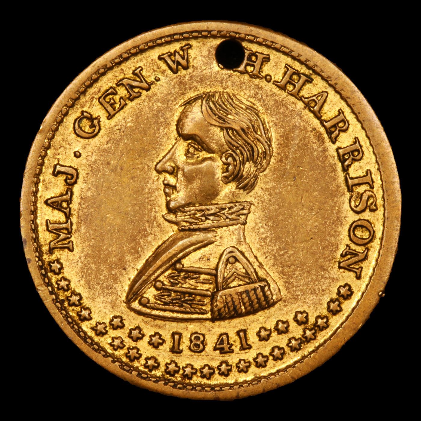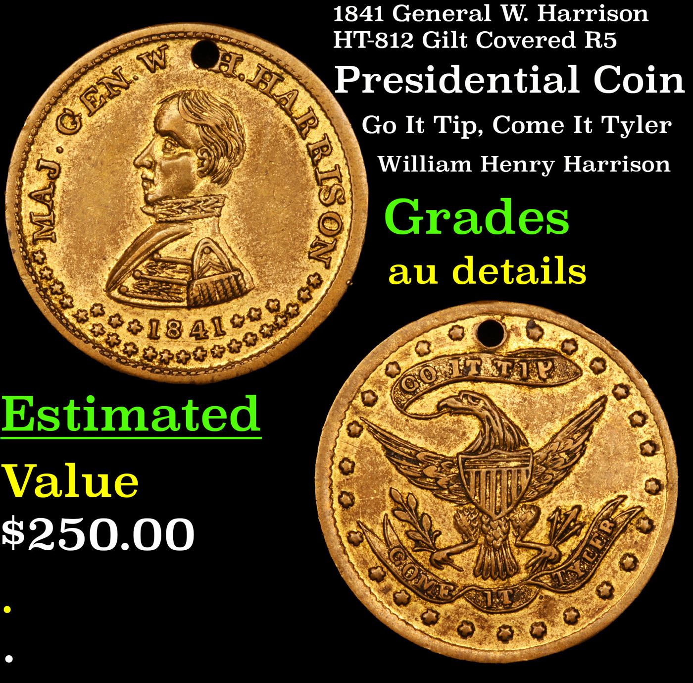 1841 General W. Harrison HT-812 Gilt Covered R5 Presidential Token Grades AU Details. Ultra Rare Gilt Covered HT-812 Bust of William Henry Harrison in uniform with Maj. Gen. W.H. Harrison, stars and the year 1841 on the obverse. A spread winged eagle with American shield on its chest and an olive branch and arrows in its talons. Riband above with the motto, "Go It Tip," and below, with the motto, "Come It Tyler" with encircling stars around the edges. There is a very tiny hole in the top of the token where it was once worn on a chain.