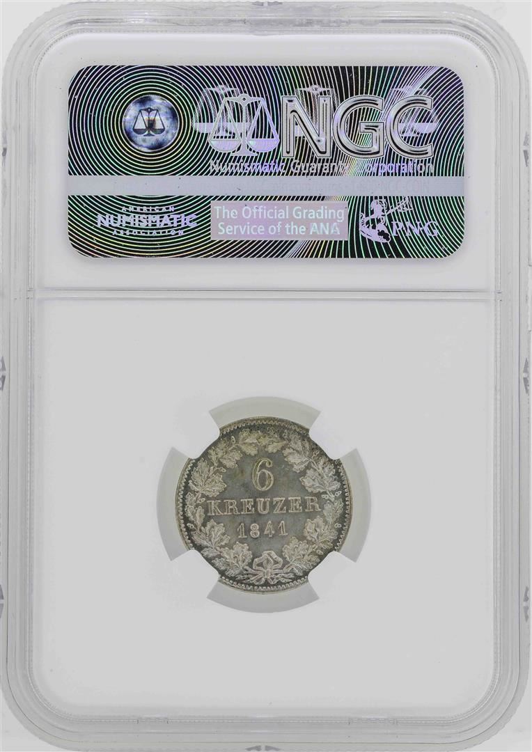 One 1841 Germany Baden 6 Kreuzer Coin NGC MS65. NGC Certified.