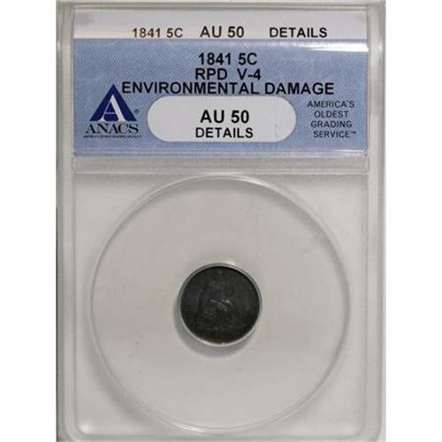 <B>1841 H10C --Environmental Damage, Repunched Date--ANACS AU50 Details.</B></I> V-4. NGC Census: (0/144). PCGS Population (0/93). Mintage: 1,150,000. Numismedia Wsl. Price for NGC/PCGS coin in AU50: $92. (#4328)<BR><I>From The Al Blythe Collection of Half Dimes.</B></I><BR><BR><B>Coin Engraver:</B> Christian Gobrecht<BR><BR><b>Shipping:</b> Coins & Currency (<a target="_blank" href="http://www.heritageauctions.com/common/shipping.php">view shipping information</a>)