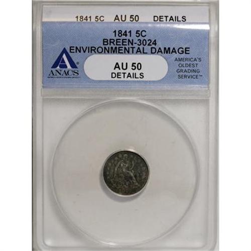 <B>1841 H10C --Environmental Damage--ANACS AU50 Details.</B></I> Breen-3024. NGC Census: (0/144). PCGS Population (0/93). Mintage: 1,150,000. Numismedia Wsl. Price for NGC/PCGS coin in AU50: $92. (#4328)<BR><I>From The Al Blythe Collection of Half Dimes.</B></I><BR><BR><B>Coin Engraver:</B> Christian Gobrecht<BR><BR><b>Shipping:</b> Coins & Currency (<a target="_blank" href="http://www.heritageauctions.com/common/shipping.php">view shipping information</a>)