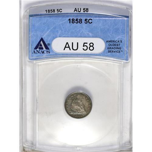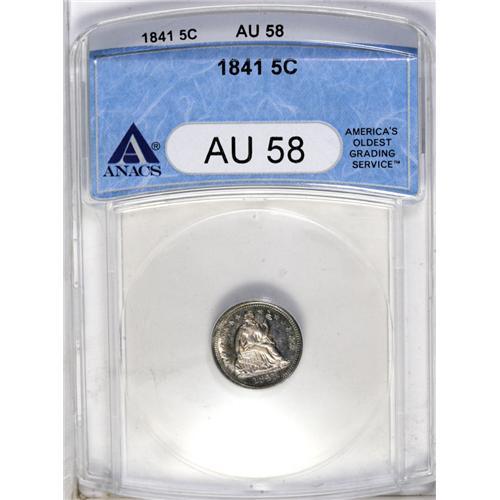 <B>1841<H10C> AU58 ANACS,</B></I> forest-green, gold, and mauve toning, slight wear on the thigh; and an <B>1858 AU58 ANACS,</B></I> boldly struck, rich gray and ocean-blue patina, light obverse hairlines.