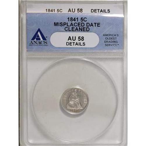 <B>1841 H10C --Cleaned, Misplaced Date--ANACS AU58 Details.</B></I> NGC Census: (9/129). PCGS Population (8/80). Mintage: 1,150,000. Numismedia Wsl. Price for NGC/PCGS coin in AU58: $115. (#4328)<BR><I>From The Al Blythe Collection of Half Dimes.</B></I><BR><BR><B>Coin Engraver:</B> Christian Gobrecht<BR><BR><b>Shipping:</b> Coins & Currency (<a target="_blank" href="http://www.heritageauctions.com/common/shipping.php">view shipping information</a>)