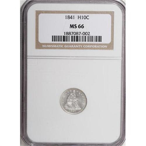 <B>1841 H10C MS66 NGC.</B></I> Spectacularly preserved even by the standards of this half dime issue, which is moderately available in Mint State grades. The minimally toned silver-white fields are carefully preserved, and only careful scrutiny reveals a faint diagonal mark above and to the right of Liberty's shield. Census: 6 in 66, 5 finer (10/07).<BR><BR><B>Coin Engraver:</B> Christian Gobrecht<BR><BR><b>Shipping:</b> Coins & Currency (<a target="_blank" href="http://www.heritageauctions.com/common/shipping.php">view shipping information</a>)