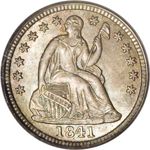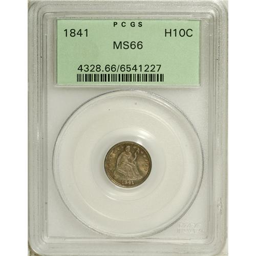 <B>1841 H10C MS66 PCGS.</B></I> Forest-green and rose-gray toning embrace this intricately struck and unabraded Premium Gem. Scarcer than expected in Mint State, given a mintage of 1.15 million pieces. Struck from moderately clashed dies, and encapsulated in a green label holder. Population: 7 in 66, 4 finer (11/06).<BR><BR><b>Shipping:</b> Coin/Currency (<a target="_blank" href="http://www.heritageauctions.com/common/shipping.php">view shipping information</a>)