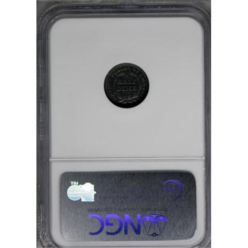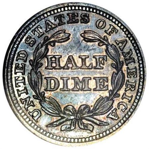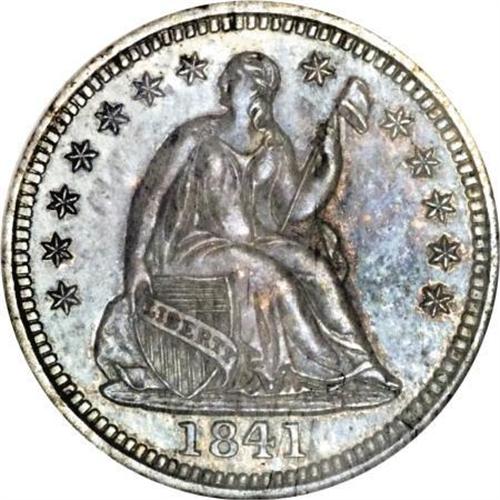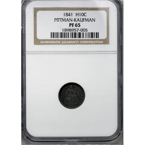 <B>1841 H10C PR65 NGC.</B></I> Ex: Pittman-Kaufman. Although we have not seen all proof half dimes of this date that currently exist, we believe the Kaufman specimen is the finest known, or at least tied for the finest known. While the number of 1841 proof half dimes that were minted was apparently unrecorded, Walter Breen, in his 1988 <I>Encyclopedia </B></I>says "possibly 8 proofs." This estimate more or less coincides with the current NGC/PCGS population reports, which illustrate five pieces graded by NGC--PR63, a PR63 Cameo, a PR64, and two PR65 coins, one of which is the present Pittman-Kaufman coin. PCGS has seen one example-a PR63.<BR><BR>In his cataloging of the 1841 proof half dime from the <I>John Jay Pittman Collection</B></I> David Akers writes:<BR><BR>"The Proof silver coins of 1841 are all extremely rare, indeed, among the rarest of the entire decade. Unlike the silver dollar and the two copper denominations, which were all struck in additional quantities, the Proof Half Dime was struck only for inclusion in the year's Proof sets, which probably numbered about 10. No more than 5-6 Proof 1841 Half dimes are known today. Eliasberg, Norweb, Garrett, and Starr, all great collections, failed to have a Proof of this issue."<BR><BR>Our research of auction records resulted in the following roster of 1841 proof half dimes:<BR><B>1. PR65 NGC. The present Kaufman piece.</B></I> David Bullowa (5/1952); John Jay Pittman (David Akers, 10/ 1997), lot 465, $15,400.<BR><BR><B>2. PR65 NGC.</B></I> Superior (5/1990), lot 3567, $5,775; Phil Kaufman; Bowers and Merena (3/1998), lot 501, $15,400. Mr. Kaufman owned this coin when he purchased the Pittman specimen, which he felt was the nicer coin. This duplicate was sold a few months later.<BR><BR><B>3. PR64 NGC.</B></I> Harlan P. Smith (S.H. and H. Chapman, 5/1906); John M. Clapp; Clapp Estate (1942); Louis E. Eliasberg, Sr.; Eliasberg Estate (Bowers and Merena, 5/1996), lot 955; Richmond Collection (David Lawrence, 3/2005), lot 1082, $20,700.<BR><BR><B>4. PR63 NGC.</B></I> Superior, (10/2000), lot 4320, $6,900; Goldberg Coins (5/2001), lot 473, $9,488; Superior (6/ 2002), lot 4140, $14,950.<BR><BR><B>5. PR62.</B></I> Stack's (11/1989), lot 394, $6,050.<BR><B>6. PR60 ANACS.</B></I> Stack's (12/1999), lot 1592; Superior (10/2000), lot 4321, $3,105.<BR><B>7. PR60.</B></I> 1987 ANA (Bowers and Merena, 8/1987), lot 237; Stack's (3/1991), lot 1504, $2,750; Stack's (3/ 1996), lot 249, $1,155.<BR><BR><B>8. Proof.</B></I> New England Rare Coin Auctions (3/1997), lot 41.<BR><B>9. Proof.</B></I> Smithsonian Institution.<BR><B><I>Additional Appearances</B></I></B></I><B>:<BR>A. PR63 NGC. </B></I>Teletrade (4/1992), lot 347, $8,193. This is almost certainly the same PR63 NGC above.<BR><B>B. Proof.</B></I> William Cutler Atwater (B. Max Mehl, 6/1946), lot 1147. "Proof, but not in full brilliancy. Slightly rubbed on obverse field. A beautiful specimen just the same."<BR><B>C. Proof. </B></I>Dr. Charles W. Green (B. Max Mehl, 4/1949), lot 1086.<BR><BR>A wonderful mélange of deep reddish-gold, electric-blue, and violet toning bathes the obverse of this Gem proof, while slightly lighter shades of sky-blue and gold-beige patina reside on the reverse. The depth of the toning does not diminish the high degree of contrast between the mirrored fields and satiny motifs. A bold strike brings out razor-sharp definition on the design elements, and a high wire rim encircling both sides frames sharp dentilation. Well cared-for surfaces render it difficult to discern identifying markers. <BR><BR>This coin is cataloged as Valentine-1, a proof-only variety, as per Daniel Valentine (<I>The United States Half Dimes</B></I>). The two 1's in the date are slightly lower than the 8 and the 4, a die scratch is visible below the arm holding the Liberty cap, and there is a slight flaw above the D of UNITED.<BR><BR>We expect that the Kaufman specimen's outstanding eye appeal and technical quality will generate spirited bidding among connoisseurs of Seated Liberty proof coinage.<BR><I>From The Phil Kaufman Collection of Early Seated Proof Sets, Part Two.</B></I><BR><BR><B>Coin Engraver:</B> Christian Gobrecht<BR><BR><b>Shipping:</b> Coins & Currency (<a target="_blank" href="http://www.heritageauctions.com/common/shipping.php">view shipping information</a>)