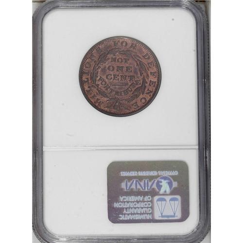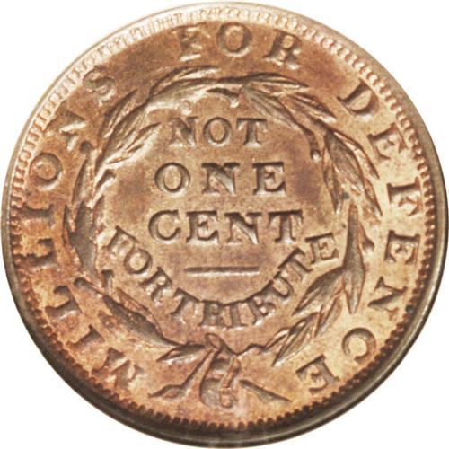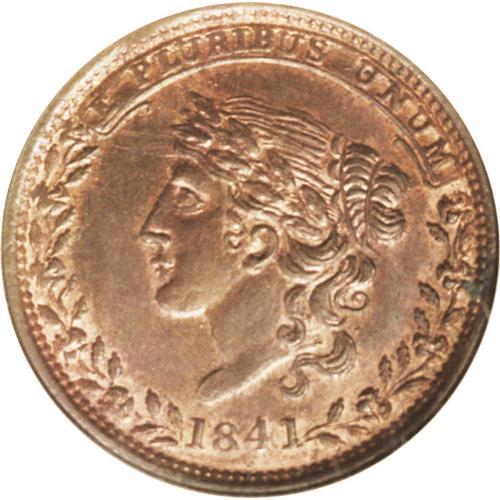<B>1841 Liberty--Not One Cent, Low-69, HT-58, MS64 Red and Brown NGC.</B></I> The berry above the N in NOT distinguishes HT-58 from the very rare HT-59 and HT-60 variants. Glowing gold luster dominates the reverse, which on its own challenges a full Red designation. The obverse also has substantial mint red, although Liberty's cheek and neck as well as the field are toned brown. A few hair-thin horizontal marks in front of the forehead identify the present piece.<BR><I>From The Troy Wiseman Collection.</B></I>