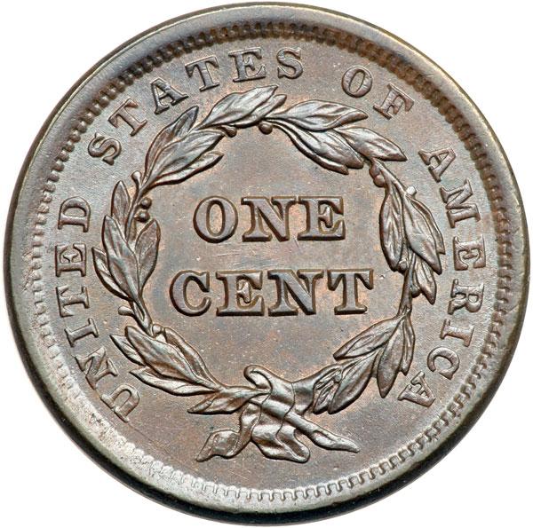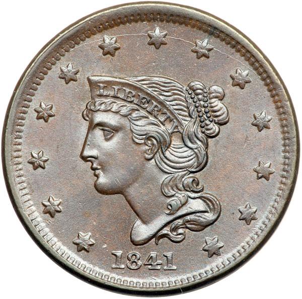 1841 N-4 R1 MS62. Lustrous bluish steel brown with traces of faded mint red on the reverse. There is a small, very light nick in the field under star 10 and a tiny planchet flake right of star 1, as struck. Excellent eye appeal for the grade, close to choice. MDS, die state c, with a thin rim cud break under the date. The fine die lines above ERI are mostly visible but the ones under the 4 are weak. Tied for CC#3 in the Grellman census. DWH #2014.