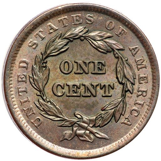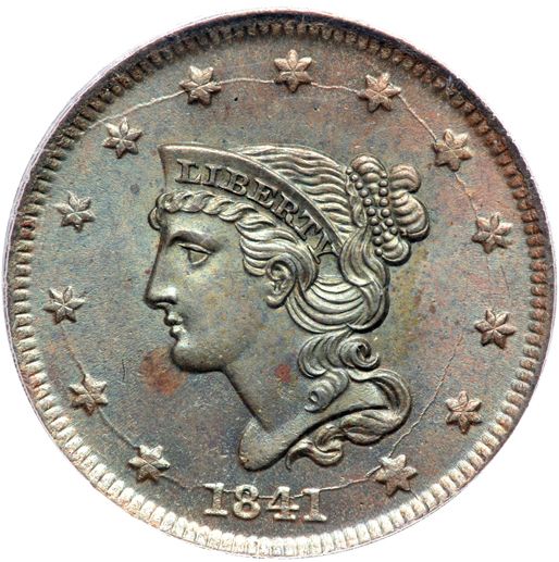 1841 N-5 R3. PCGS graded MS-63 Brown. The obverse is lustrous steel brown with subtle overtones of sea-green and light bluish steel. The reverse is lustrous light steel brown and chocolate. There is a splash of reddish chocolate toning off the tip of the chin and a smaller one on the neck, and these are the only notable marks on an otherwise very attractive cent. LDS, die state d, with die cracks on both sides. Called MS63 and CC#2 in the Noyes census, his photo #30916. Our grade is MS60+, CC#2 in the Grellman census.