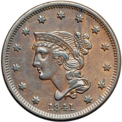1841 N-5 R3. VF-35. Glossy brown and light olive with frosty lighter brown in protected areas. Only trivial contact marks and a shallow planchet flake in the dentils at the U in UNITED. Scarce EDS, die state b (an uncracked state a is unknown and may not exist). The die cracks are very light and the die lines at the N in CENT are visible.