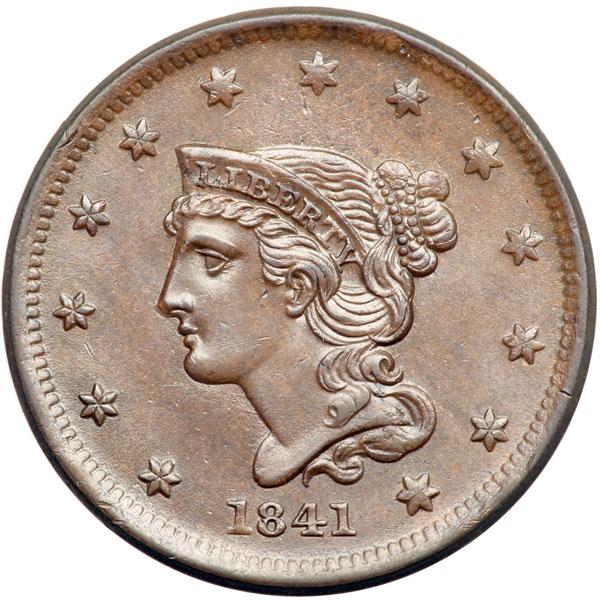 1841 N-6 R1 MS60. Frosty bluish steel brown with satiny, lustrous surfaces and traces of faded mint red on both sides. There is a very faint vertical hairline in the field under the chin and shallow planchet chips on the rim over STAT, as struck. LDS, die state c. The obverse fields are wavy, including a vertical wave in the field behind the portrait. Removed from a PCGS slab graded MS64BN (PCGS label included). DWH #2015.