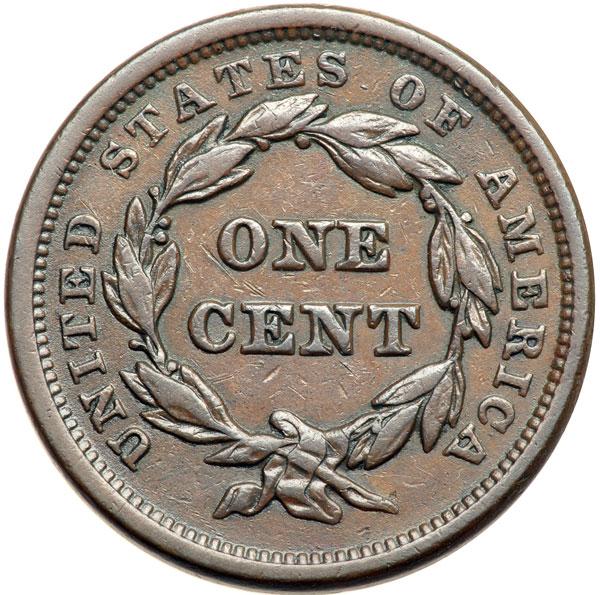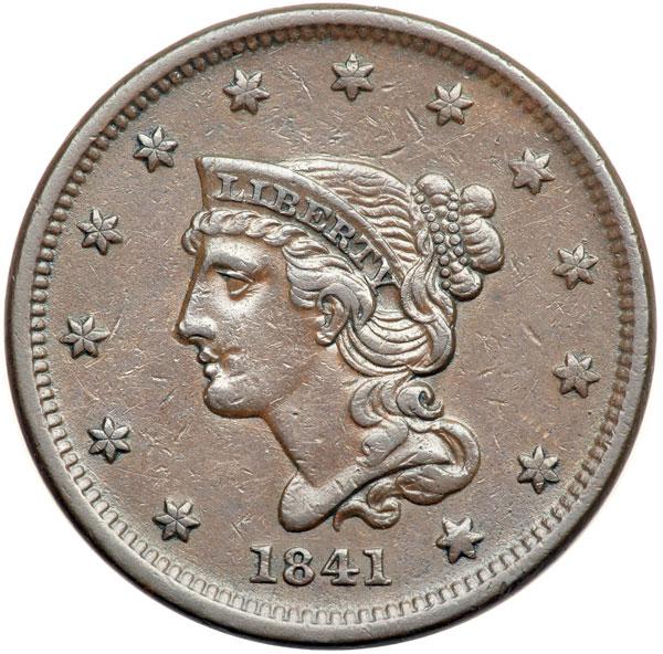 1841 N-6 R1 VF25. Five points sharper with too many tiny nicks for the higher grade, none notable. A very thin diagonal nick under the left edge of the O in ONE is the best identifying mark. Glossy chocolate brown. E-MDS, die state a late. The fine die lines at TE in UNITED and ER in AMERICA are weak but visible. DWH #0884.