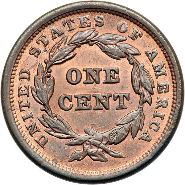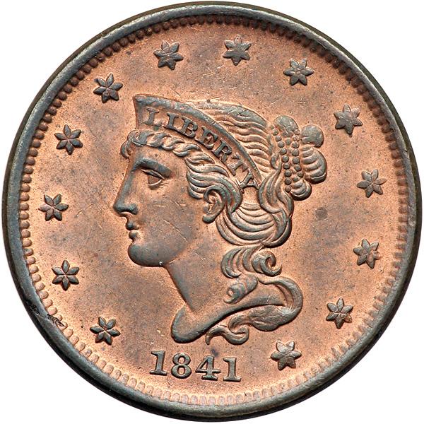1841 N-6 R1. MS-63. Frosty mint red fading to steel brown on the highpoints, nearly half the mint color remaining. Satiny mint luster covers the planchet. The notable marks are a shallow planchet flake in the dentils left of star 1, a small planchet flake under ST in STATES, and a thin horizontal nick over the N in CENT. MDS, die state b. The die lines from the neck and main curl are dull but remain visible. An attractive cent, tied for CC#3 for the variety.