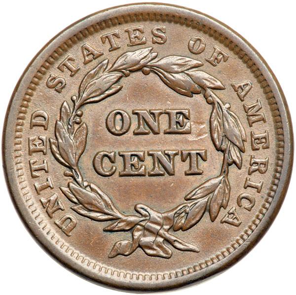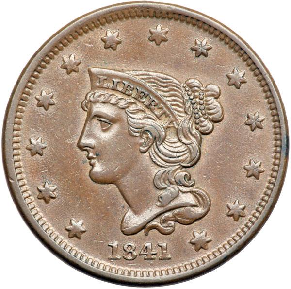 1841 N-7 R2 EF40. Five points sharper with a small, light rim bruise at star 7 and another under the stem tip. Otherwise this cent is choice. Glossy medium brown with frosty lighter steel brown toning in protected area and a few peeps of faded mint red on both sides. E-MDS, die state a. The die defects under the 1 and 4 are dull but visible. DWH #0885.