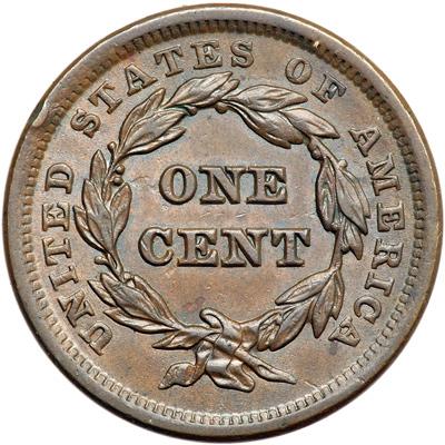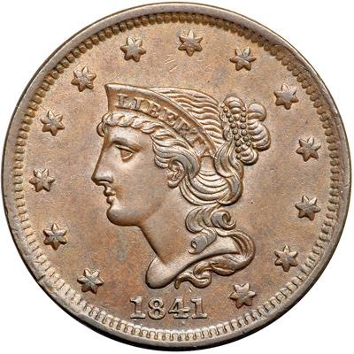 1841 N-7 R2. EF-45. Five points sharper but there is a dull rim nick at the first S in STATES. Otherwise the surfaces are satiny and very attractive, virtually flawless. Frosty light chocolate brown. Nicely struck EDS, die state a. The die lumps under the first 1 and the 4 are clear and the obverse die is uncracked.
