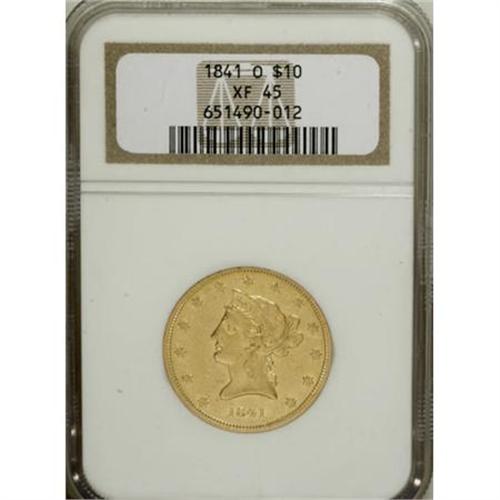 <B>1841-O $10 XF45 NGC.</B></I> An important rarity in the Liberty eagle series with a mintage of just 2,500 coins. It is the first coin of the ten dollar denomination struck in New Orleans. These two facts combine to create considerable demand for the date. This piece has deep green-gold surfaces with reflective fields and hints of luster. Census: 15 in 45, 22 finer (10/07).<BR><BR><B>Coin Engraver:</B> Christian Gobrecht<BR><BR><b>Shipping:</b> Coins & Currency (<a target="_blank" href="http://www.heritageauctions.com/common/shipping.php">view shipping information</a>)