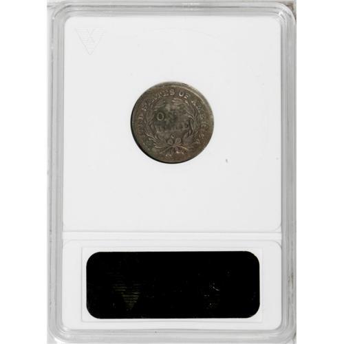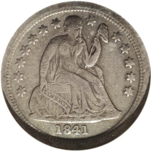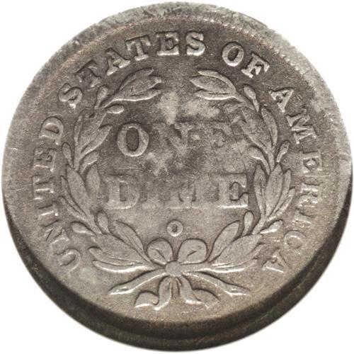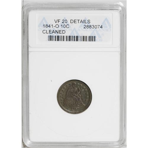 <B>1841-O<10C>--Cleaned--ANACS. VF20 Details.</B></I> Fortin-102. Small O, Closed Bud Reverse. This reverse variant was listed in Brian Greer's 1991 reference on Seated dimes as "excessively rare" and he stated that fewer than 10 examples have been reported since its discovery in 1981. Gerry Fortin commented wrote about this variety: "Reverse B is a second left over reverse die from 1840 used to create a transitional variety. Its final die state was previously documented within the description of the 1840-O Variety 107 listing. When paired with the 1841 Obverse 1, very late die states of Reverse B show excessive wear in the center of the reverse due to a die bulge. This is an excessively rare transitional variety. I consider both the Large and Small O transitional Closed Bud dimes to be key coins in the Major 100 Seated Dime Variety set.<BR> This is a later die state, as mentioned above, with noticeable die bulging in the center of the reverse. Cleaned long ago, the surfaces have retoned to a deep gray-green with shades of underlying rose occasionally visible.