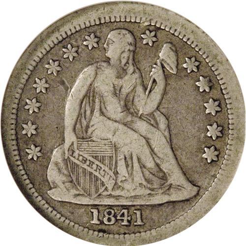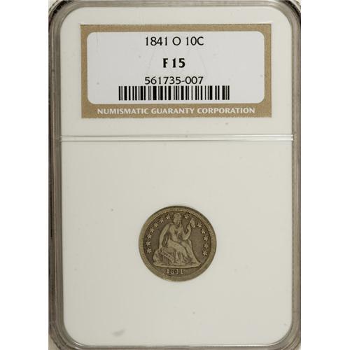 <B>1841-O 10C Fine 15 NGC.</B></I> Closed Bud, Large O Reverse. Fortin-101, R.7. A bit of background information is necessary to understand the rarity and importance of this variety. John McCloskey wrote of these pieces--which Kamal Ahwash apparently discovered sometime in the late 1970s--in the July 1981 <I>Gobrecht Journal:</B></I><BR><BR> "New Orleans dimes were first struck in 1838 and for the first three years of dime production at the facility, a No Drapery obverse design was used. The obverse was then modified to a new With Drapery design that appeared for the first time in 1841 at the branch mint facility. Not as well known is the fact that the reverse design was also modified after three years of dime production in New Orleans. From 1838 to 1840 a closed bud reverse design was used on all New Orleans dimes. In 1841 a new reverse design with open buds in the wreath was introduced into New Orleans dime production. We thus had a new obverse design and a new reverse design for the production of 1841-O dimes. The mintmarks on the new reverses used in 1841 were all small and round and centered under the left leg of the M in DIME within the wreath."<BR><BR> A club member wrote McCloskey and reported an 1841-O dime with the Closed Bud reverse, and then the race was on. He and Ahwash looked at hundreds of 1841-O dimes. They found very few with the old reverse. The pieces were considered a transitional variety. Then in April 1981 a second transitional variety was discovered with the Small Mintmark.<BR> All Closed Bud 1841-O dimes are rare. Just how rare is a matter of some conjecture, but in Brian Greer's reference on Seated dimes (1992) he reported that only 10 examples of the Small O and 20 pieces of the Large O were known. We have only offered one other Closed Bud reverse 1841-O in the past 15 years, and that was a Small O coin that had been cleaned. The surfaces of this piece are deep gray-burgundy with near-brilliance over the highpoints. The surfaces are uncleaned and show only the slight imperfections one would expect from 45 points of wear. One of the keys to the Seated dime series, this coin will undoubtedly be a highlight of an advanced collection of this popular series.<BR><BR><b>Shipping:</b> Coins & Currency (<a target="_blank" href="http://www.heritageauctions.com/common/shipping.php">view shipping information</a>)