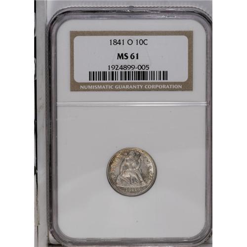 <B>1841-O<10C> MS61 NGC.</B></I> Whispers of cobalt-blue, lavender, and gold-tan gravitate to the borders of this bright O-Mint dime that exhibits sharp definition throughout the design elements. Some wispy slide marks on the obverse account for the grade. Census: 5 in 61, 20 finer (7/06).