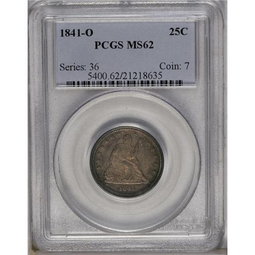<B>1841-O<25C> MS62 PCGS.</B></I> Pumpkin and light violet toning covers the clean fields and devices. Striking weakness on Liberty and on the eagle and shield keeps this coin from Select status.