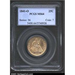 1841-O 25C MS64 PCGS. Lightly toned and surprisingly lustrous for a product from the New Orleans mint. The central details are weakly defined, as usual, but there are no mentionable abrasions on either side of this always sought-after early Seated Quarter. Population: 5 in 64, 0 finer (11/01). Important notice: We expect to be auctioning lots at the rate of 200-250 per hour. Sometimes eBay Premier live bid software cannot keep up with that pace, so we strongly recommend that you place a realistic proxy bid now as insurance to avoid disappointment. Also please note that all Heritage/CAA lots purchased through eBay Premier carry a 20% Buyer's Premium.