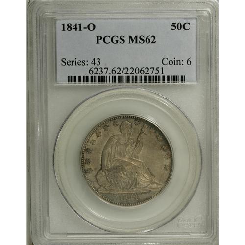<B>1841-O 50C MS62 PCGS.</B></I> This well struck New Orleans Seated half is originally toned in deep silver-gray color, and a few trivial obverse field marks are less than expected for the grade. An extensive network of die cracks on the reverse should be of interest to the specialist. Population: 15 in 62, 14 finer (11/06).<BR><BR><b>Shipping:</b> Coin/Currency (<a target="_blank" href="http://www.heritageauctions.com/common/shipping.php">view shipping information</a>)