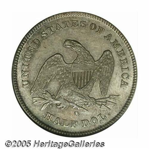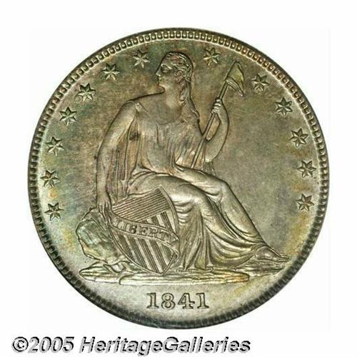 <B>1841-O<50C> MS64 NGC.</B></I> Satiny and choice with deep iridescent toning, including rainbow color on the obverse and pale grayish-brown on the reverse. The obverse of this example is sharply defined, including Liberty's head details and sandal details. The reverse has some weakness of strike, especially on the claw and leg to the left. Interesting die work on the reverse includes the extension of every vertical shield line into the horizontal elements, with most extending nearly to the top shield border.