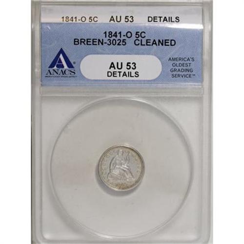 <B>1841-O H10C --Cleaned--ANACS AU53 Details.</B></I> Breen-3025. NGC Census: (1/25). PCGS Population (2/16). Mintage: 815,000. (#4329)<BR><I>From The Al Blythe Collection of Half Dimes.</B></I><BR><BR><B>Coin Engraver:</B> Christian Gobrecht<BR><BR><b>Shipping:</b> Coins & Currency (<a target="_blank" href="http://www.heritageauctions.com/common/shipping.php">view shipping information</a>)