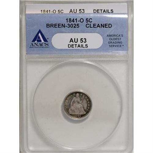 <B>1841-O H10C --Cleaned--ANACS.</B></I> <B>AU53 Details. </B></I>Breen-3025. NGC Census: (1/25). PCGS Population (2/16). Mintage: 815,000. (#4329)<BR><I>From The Al Blythe Collection of Half Dimes.</B></I><BR><BR><B>Coin Engraver:</B> Christian Gobrecht<BR><BR><b>Shipping:</b> Coins & Currency (<a target="_blank" href="http://www.heritageauctions.com/common/shipping.php">view shipping information</a>)