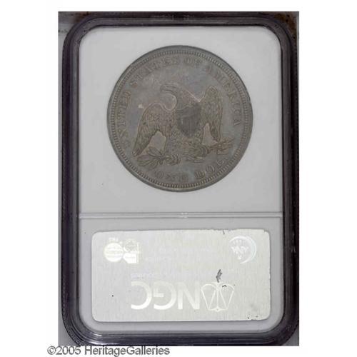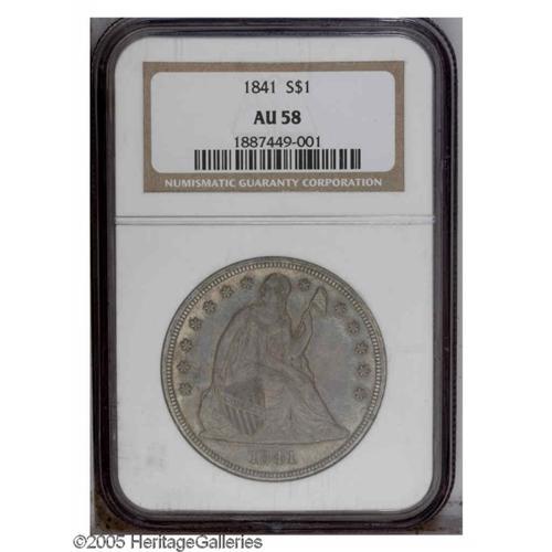 <B>1841<S$1> AU58 NGC.</B></I> Deep cobalt-blue and golden-brown patina drapes this sharply struck and generally unmarked example. Although the mintage of the 1841 is relatively generous by the standards of No Motto Seated Dollars, the issue is nonetheless very scarce in better circulated grades. Census: 38 in 58, 34 finer (10/05).