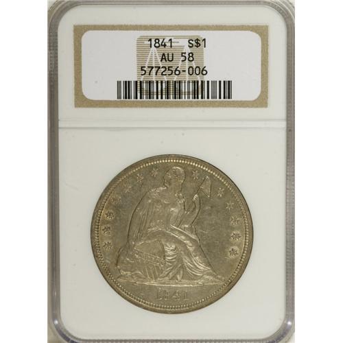<B>1841 S$1 AU58 NGC.</B></I> Light silver-gray surfaces exhibit hints of light tan-gold around some of the peripheries, and traces of luster are visible in the areas around, and in the interstices of, the design elements. Generally well struck on the devices, save for minor softness in some of the star centers, and in the hair on Liberty's head. A few minute marks are noted over each side.<BR><BR><b>Shipping:</b> Coins & Currency (<a target="_blank" href="http://www.heritageauctions.com/common/shipping.php">view shipping information</a>)