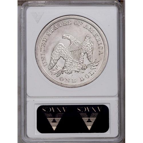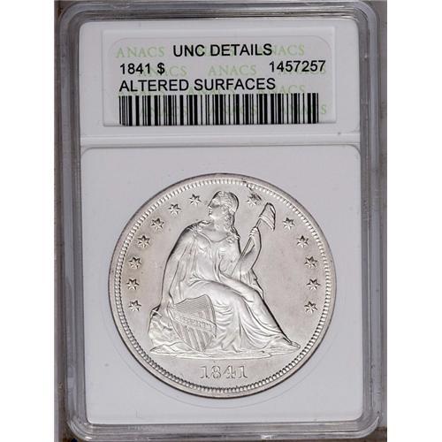 <B>1841<img border='0' src='http://www.heritagecoins.com/images/star.gif' width=10 height=10>$1>--Altered Surfaces--ANACS. Unc Details.</B></I> At first glance, this has every outward appearance of a Cameo proof, but don't be fooled. Someone spent a great deal of time polished and buffing the fields to give the deeply mirrored look to this dollar. They started with an extremely sharply struck example, probably a high level AU piece, and created the contrasting appearance. The workmanship, while not perfectly performed, is rather remarkable. Careful examination of the space between the shield lines on the reverse is an area that couldn't be polished, and true proofs have mirrored finish between the stripes.