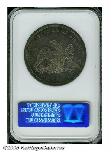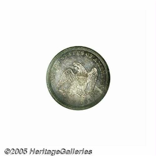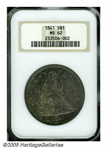 <B>1841<S$1> MS62 NGC.</B></I> The Philadelphia Mint's sizeable mintage of 173,000 coins in 1841 illustrates the near-instant popularity of the Seated Dollar among banks and bullion deposits. As this mintage figure might imply, the 1841 is not particularly difficult to locate in worn grades, at least when compared to other issues in this series. It seems likely, therefore, that virtually the entire mintage entered economic channels, and Uncirculated 1841 Seated Dollars are indeed condition rarities.<BR> This is a remarkably lustrous coin for the type as well as the grade with a softly frosted texture. Both sides are colorfully toned in purple-lilac shades that are accented with sea-green tones at the borders. It is uncommonly well struck with nearly complete definition over the central devices. A number of wispy abrasions on the reverse are consistent with the grade. Population: 15 in 62, 8 finer (6/05).<BR><I>From The Dr. John L. Pellegrini Collection of Liberty Seated Dollars.</B></I>