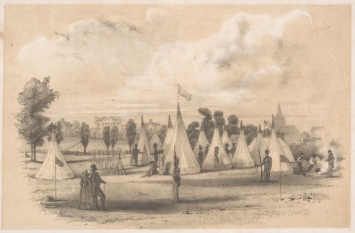 “THE WASHINGTON LIGHT GUARDS QUICK STEP” has 4 pages (2 pages of music), measures 10.25" x 13" and is in very nice condition with some overall scattered light foxing and spine wear, specially at the bottom edge. The central lithograph illustration on the front cover is a wonderful image of the Washington Light Guards Unit in their field encampment. The Washington Light Infantry of Boston was one of several militia units of that name. The first and best known was the one organized in Charleston, SC in 1807.