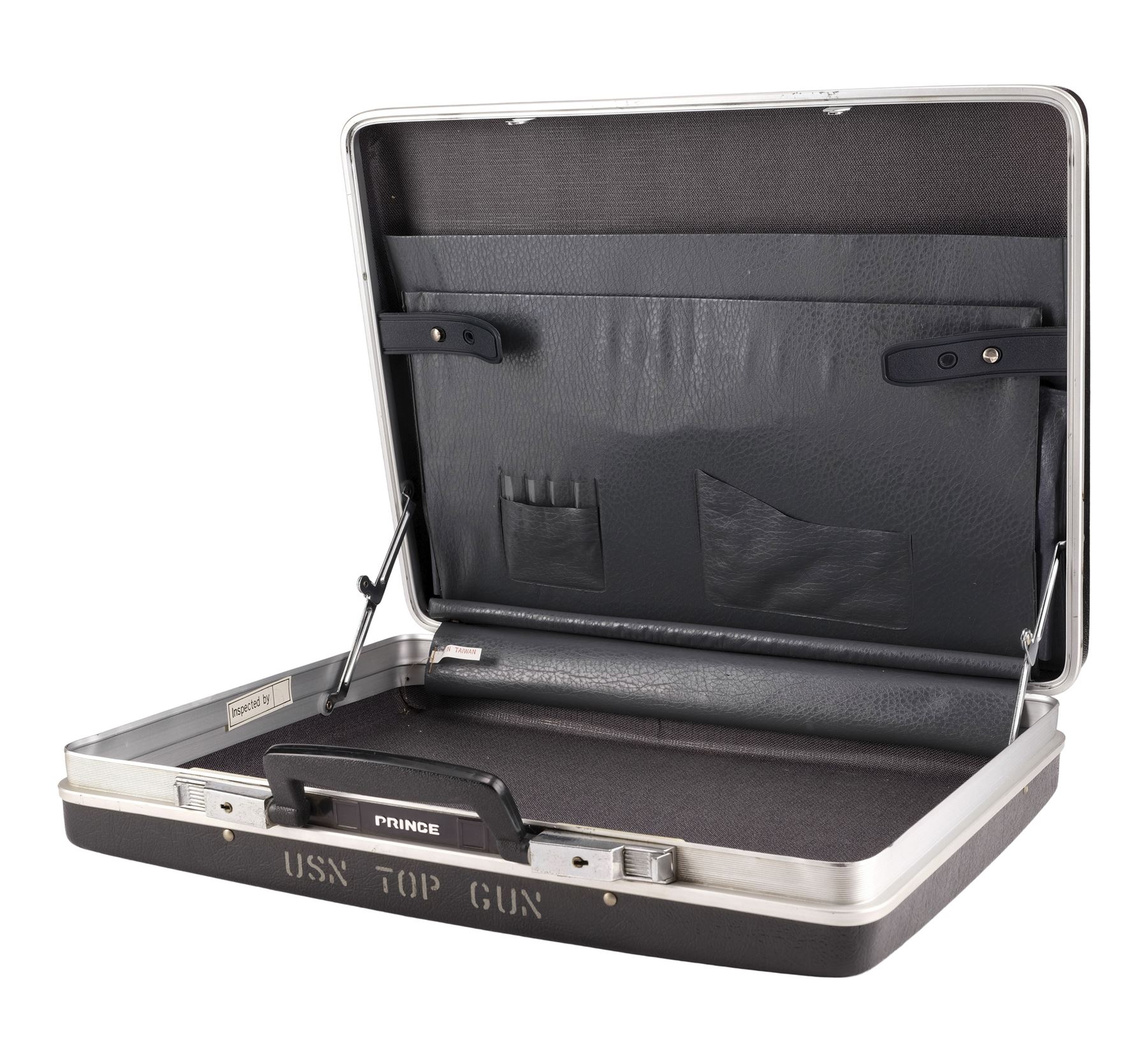 This lot consists of a black hard plastic and metal trim PRINCE briefcase with a black leather interior featuring "TOP GUN CLASSIFIED" on the front and "USN TOP GUN" by the handle both painted in white. This lot exhibits smeared paint on the front, disfiguring "CLASSIFIED." Dimensions: 13.5" x 17" x 3.5" (34.5 cm x 43.25 cm x 9 cm)