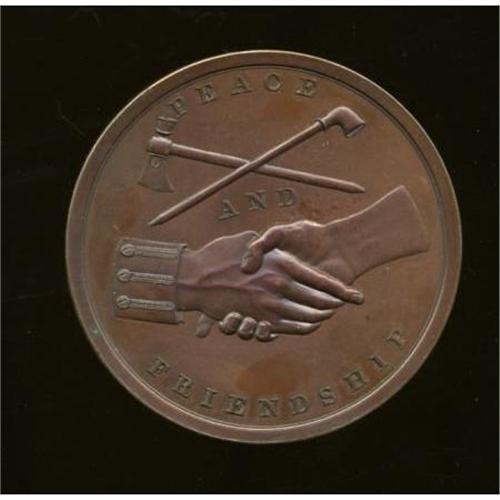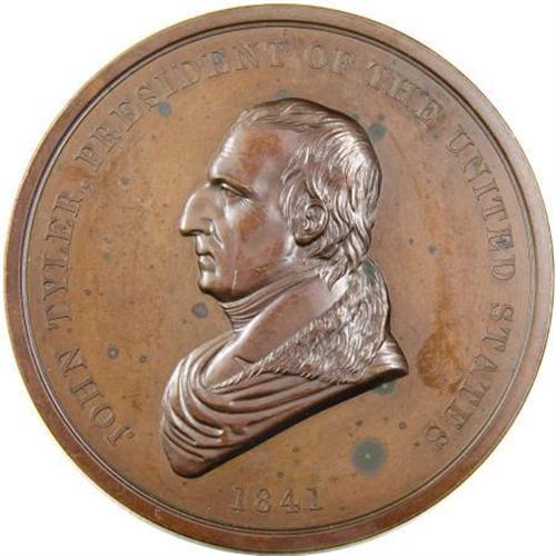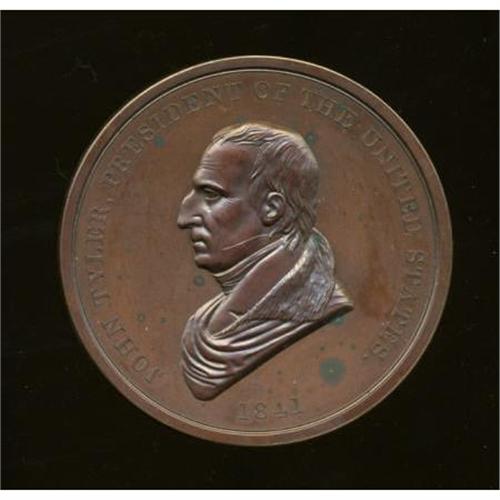 <B>1841 John Tyler Indian Peace Medal, Julian IP-21, First Size, Second Reverse, Uncirculated Uncertified.</B></I> Bronzed copper, 75.5 mm, rim 6.6 mm, 203.4 gm. Obverse unsigned (Mint Director Robert M. Patterson had a reducing machine to make the various sizes from a single portrait model rather than employing an artist such as Furst), bust left of President Tyler with date 1841, rev. the usual clasped hands, pipe and tomahawk, with PEACE AND FRIENDSHIP. The finger points to the R in FRIENDSHIP, identifying the Second Reverse. An impressive chestnut-brown example of this medal, likely MS63 or better in terms of details, but with considerable obverse carbon, including a couple of larger spots at the bust truncation and to the right of the date. Accompanied by an NGC sticker with the medal date, Julian attribution, "Reverse Dies of 1846," further adding "Corrosion" with no grade assigned. The Ford example (Stack's, Part XVIII, 5/2007, lot 110), an AU piece, brought $690.<BR><BR><b>Shipping:</b> Coins & Currency (<a target="_blank" href="http://www.heritageauctions.com/common/shipping.php">view shipping information</a>)