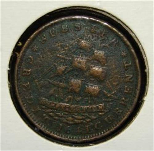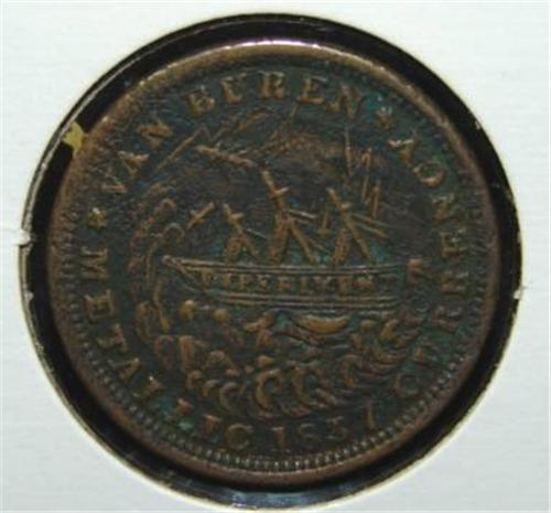 1841 U.S. TOKEN. Marked “Van Buren/Metallic/1837/Currency” and marked on reverse “Webster/Credit/1841/Current”. Decorated with ship on both sides.