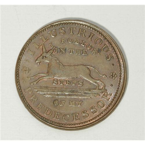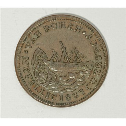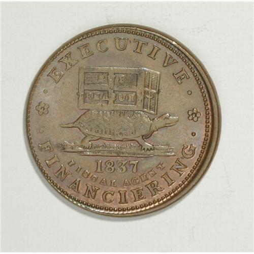 <B>1841 Webster Credit/Metallic Currency XF40 Uncertified,</B></I> Low-64, HT-22, DeWitt-CE-1838-6, R.1, tiny marks above the troubled ship; <B>1837 Executive Financiering AU55 Uncertified,</B></I> Low-20, HT-34, DeWitt-CE-1838-4, R.1, glimpses of mint red at the borders despite light wear on the donkey, a small spot above the W in FOLLOW.<BR><BR><b>Shipping:</b> Coin/Currency (<a target="_blank" href="http://www.heritageauctions.com/common/shipping.php">view shipping information</a>)