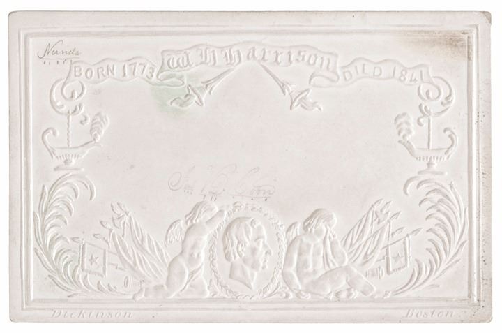 Elected in 1840, President Harrison gave his 100 minute Inaugural Speech in the snow, without hat or coat, caught pneumonia and died about a month later in 1841. Mourning cards for Presidents are not unusual, but this one is all in white and heavily embossed with its designs making it very unusual and rare. This Mourning Card has his Birth and Death dates. Two weeping angels flanking his portrait at bottom. There is also a single word penciled in the upper left corner. Aside from a couple finger smudges, this card is in excellent condition, and would make an great addition to a William Henry Harrison or Presidential Collection. The first of this type we have offered.