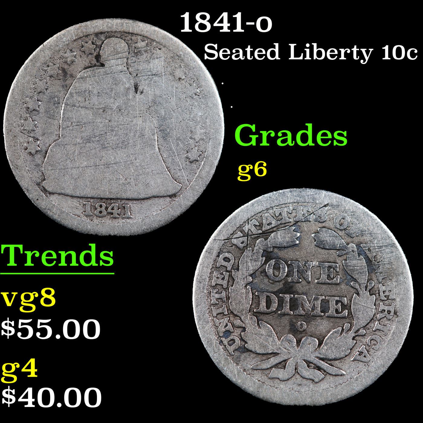 1841-o Seated Liberty Dime 10c Grades g+.