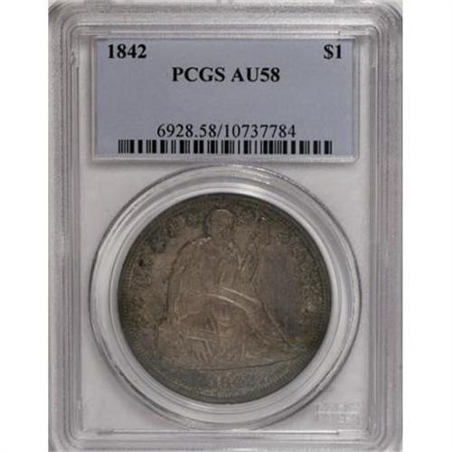 <B>1842 $1 AU58 PCGS.</B></I> Solidly struck with deep golden-gray and cerulean patina. A touch of highpoint friction denies a Mint State grade. Both sides are quite clean. Population: 25 in 58, 77 finer (1/08).<BR><BR><B>Coin Engraver:</B> Christian Gobrecht<BR><BR><b>Shipping:</b> Coins & Currency (<a target="_blank" href="http://www.heritageauctions.com/common/shipping.php">view shipping information</a>)