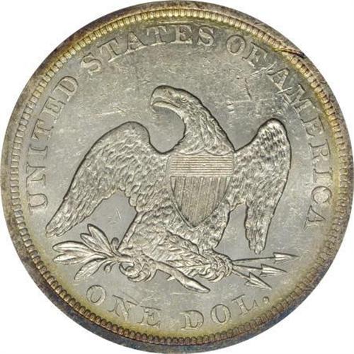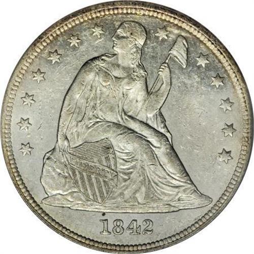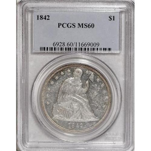 <B>1842 $1 MS60 PCGS.</B></I> All No Motto Seated dollars are scarce in Mint State, particularly if they lack a New Orleans mintmark. This well struck example is lustrous and essentially untoned, although it exhibits a golden reverse rim. Moderately abraded, and an interesting strike-through is noted at 1:30 on the reverse rim. <BR><BR><B>Coin Engraver:</B> Christian Gobrecht<BR><BR><b>Shipping:</b> Coins & Currency (<a target="_blank" href="http://www.heritageauctions.com/common/shipping.php">view shipping information</a>)