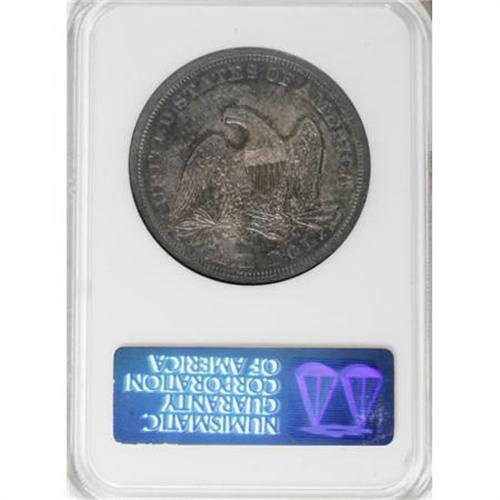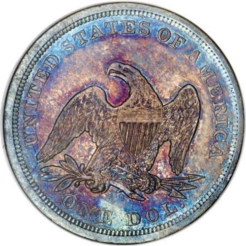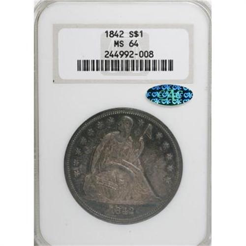 <B>1842 $1 MS64 NGC. CAC.</B></I> Normal Date, Breen-5428. The Seated Liberty silver dollars of the 1840s were produced at a time when supplies of domestic silver were scarce, and accordingly some issues saw only token mintages, while none could be considered generous. Circulated 1842 Seated dollars are fairly common, but Mint State specimens are seldom seen. Examples in MS64 or finer are quite rare. As of (3/08) NGC has certified only 20 examples in MS64, with none finer.<BR> This piece shows the bright, semiprooflike fields that are often encountered on Seated dollars from the 1840s and 1850s. The centers show rich reddish-gray toning and are surrounded by deep blue at the margins. The strike is good but not full, with no obvious marks on either side. <BR><I>From The Queller Family Collection of Silver Dollars.</B></I><BR><BR><B>Coin Engraver:</B> Christian Gobrecht<BR><BR><b>Shipping:</b> Coins & Currency (<a target="_blank" href="http://www.heritageauctions.com/common/shipping.php">view shipping information</a>)